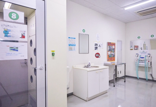 工場内への入室前にはサニタリールームにて従業員の衛生管理や身だしなみを徹底しています。